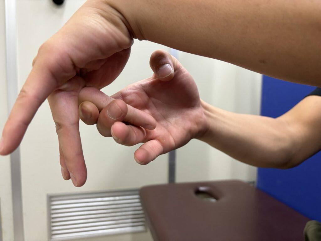 患側中指を掌側へゆっくりと牽引を加えると、短橈側手根伸筋が選択的にストレッチされる