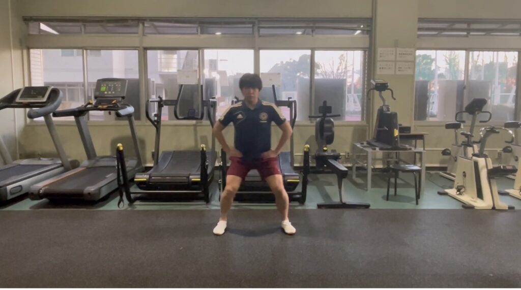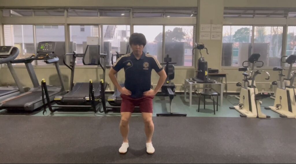 両側ハーフスクワット:膝内外反しないように、ニュートラルを保つ。