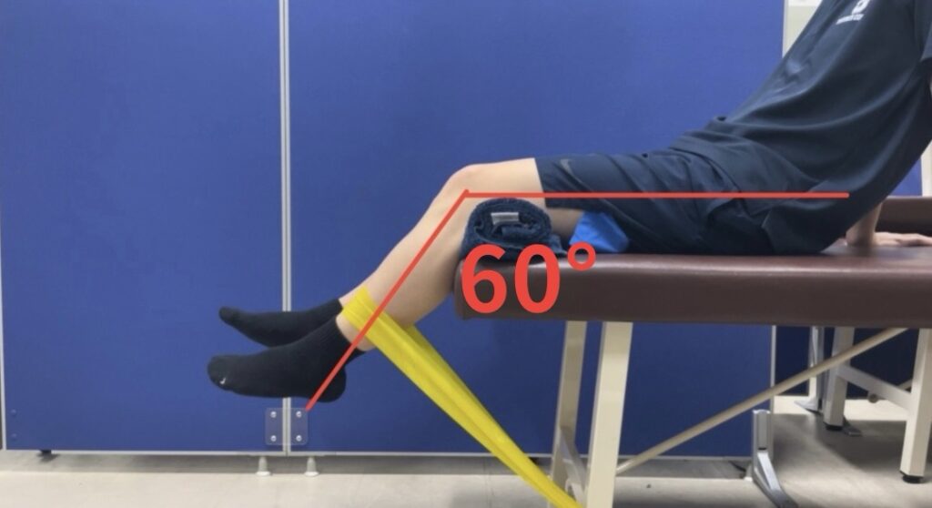 損傷した後十字靭帯の治癒を妨げない為、60°以上屈曲位での筋力強化は約3ヶ月間控える。